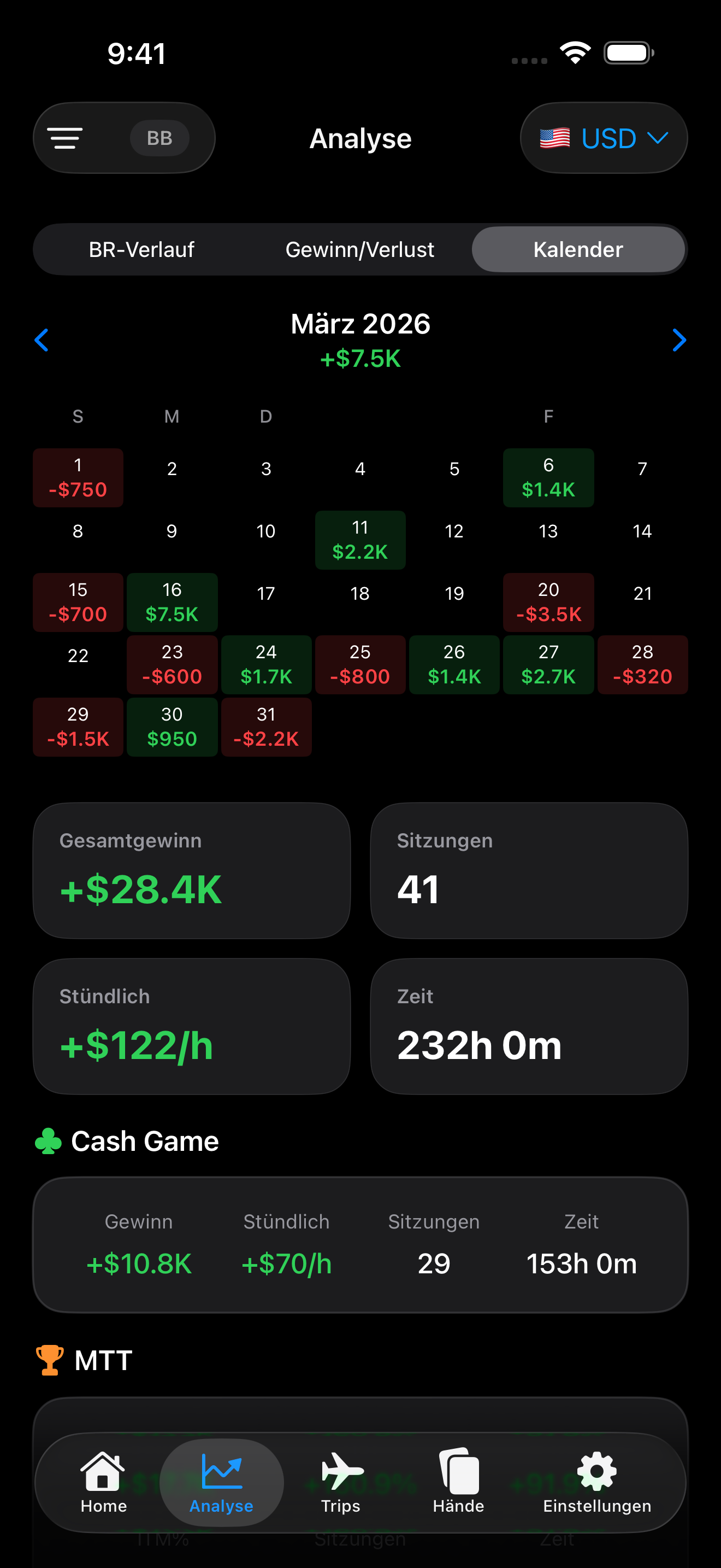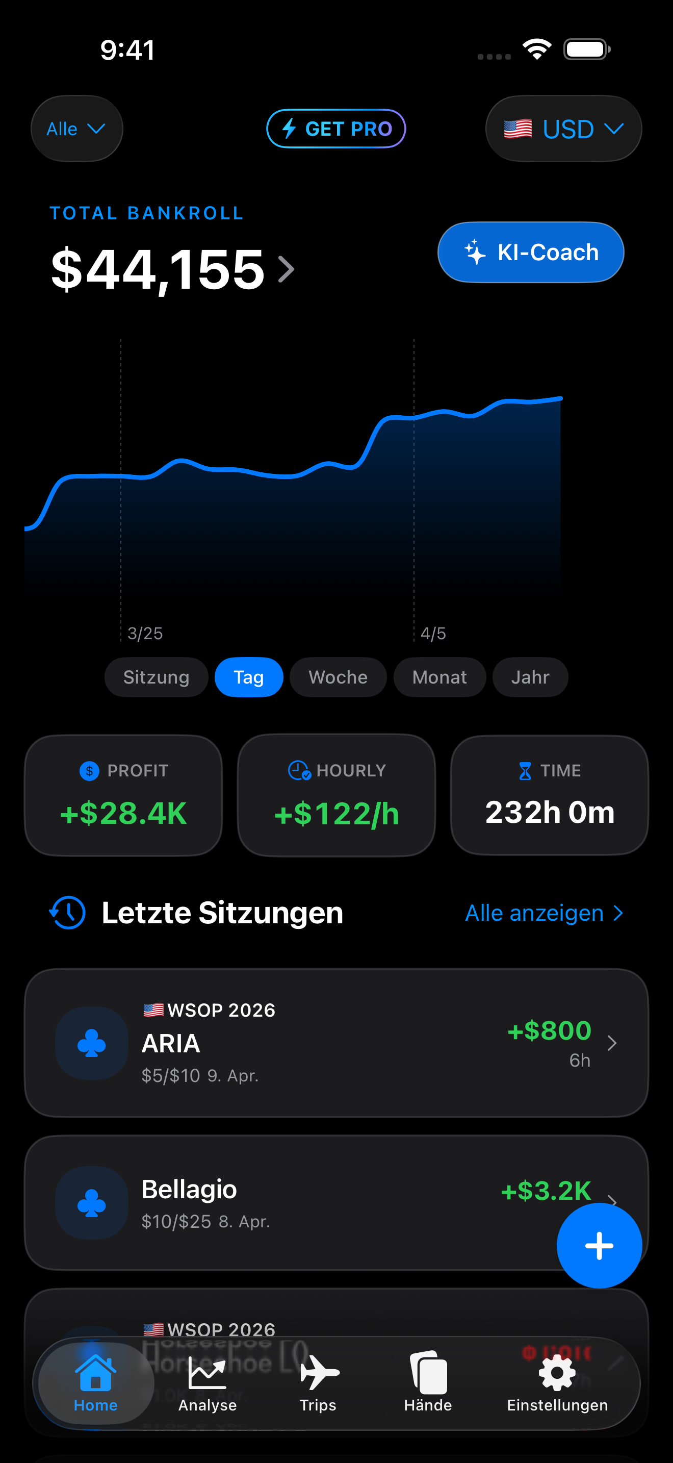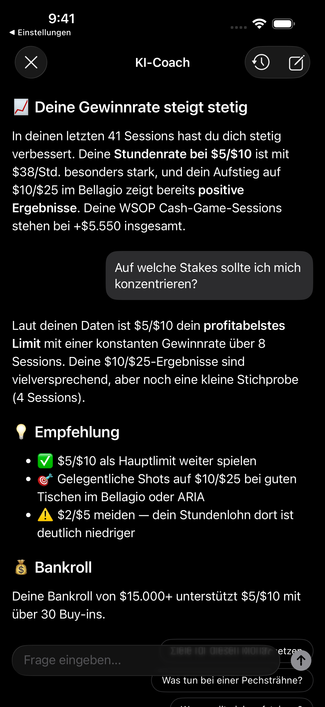 Verbessere deine Strategie mit Gewinn- und Verlustanalysen nach Stakes, Ort und Zeitraum.