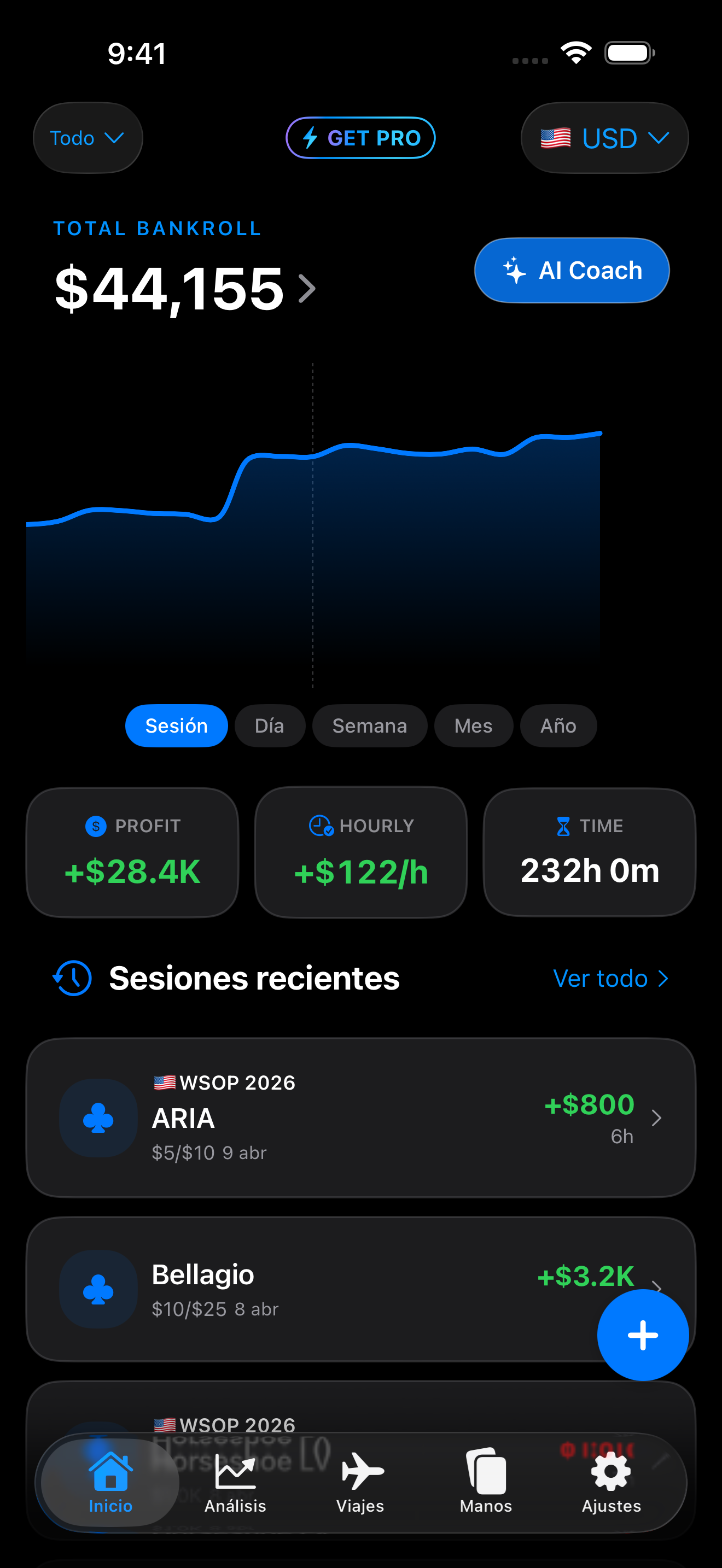 Controla ganancias y gastos por viaje o serie de torneos.