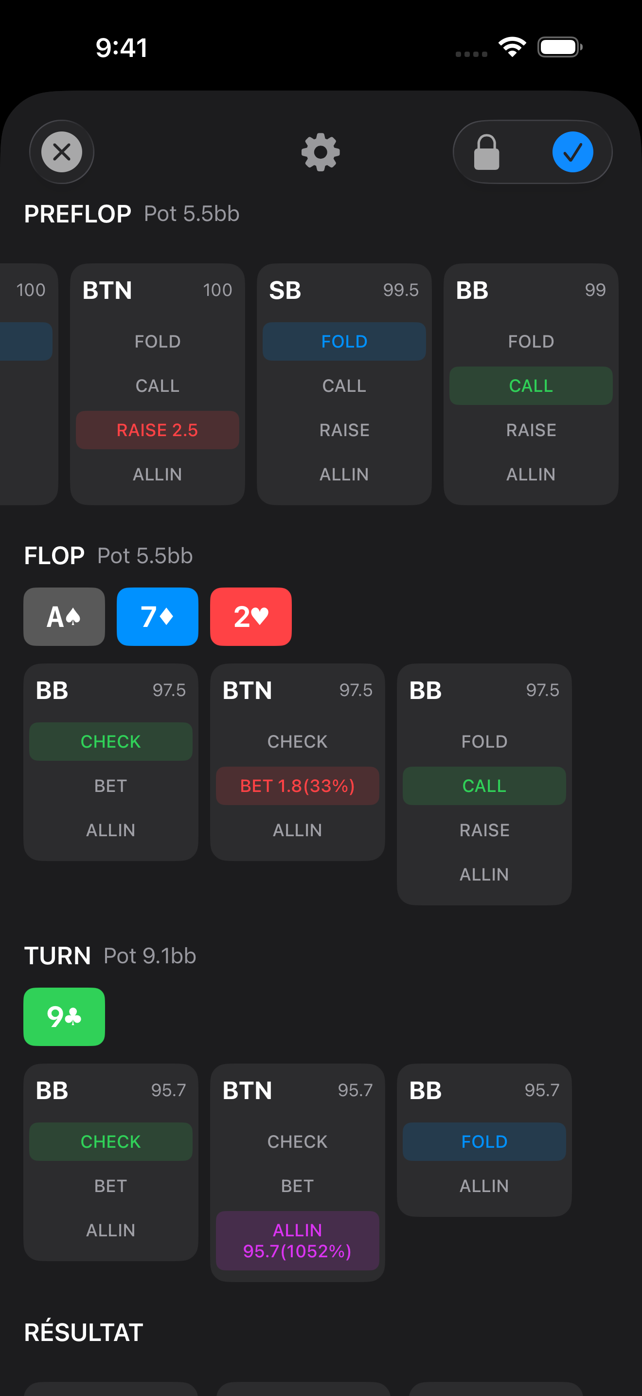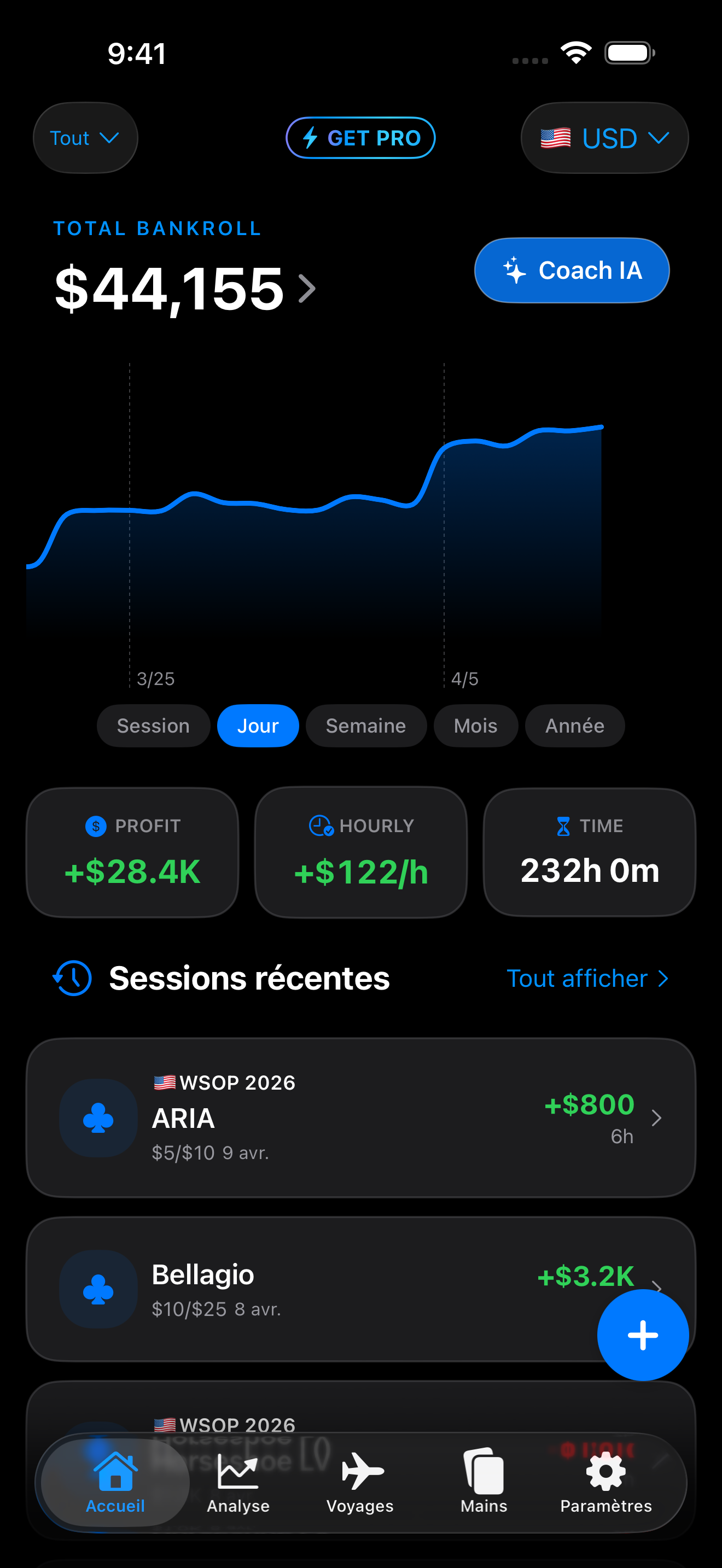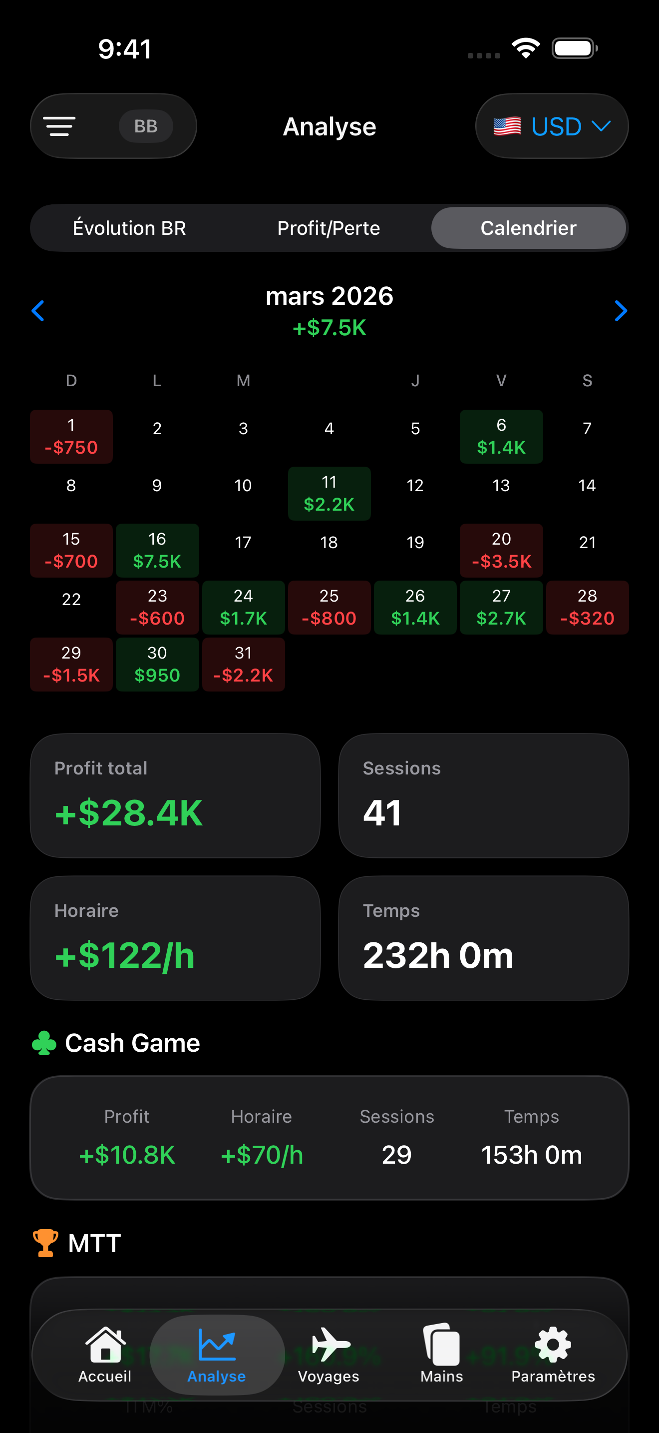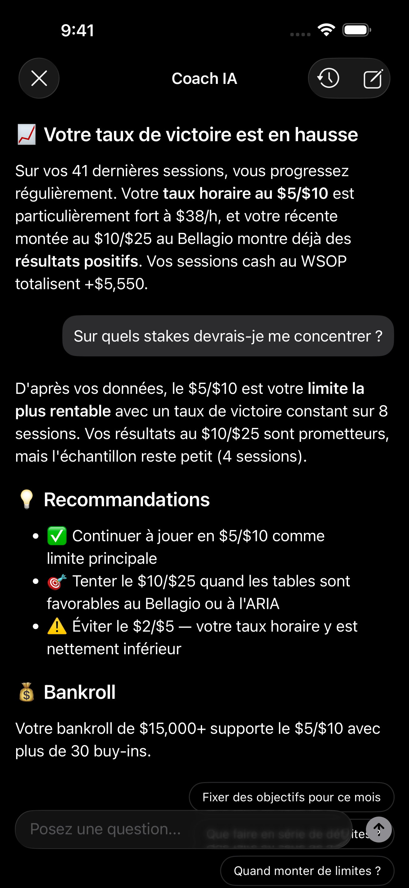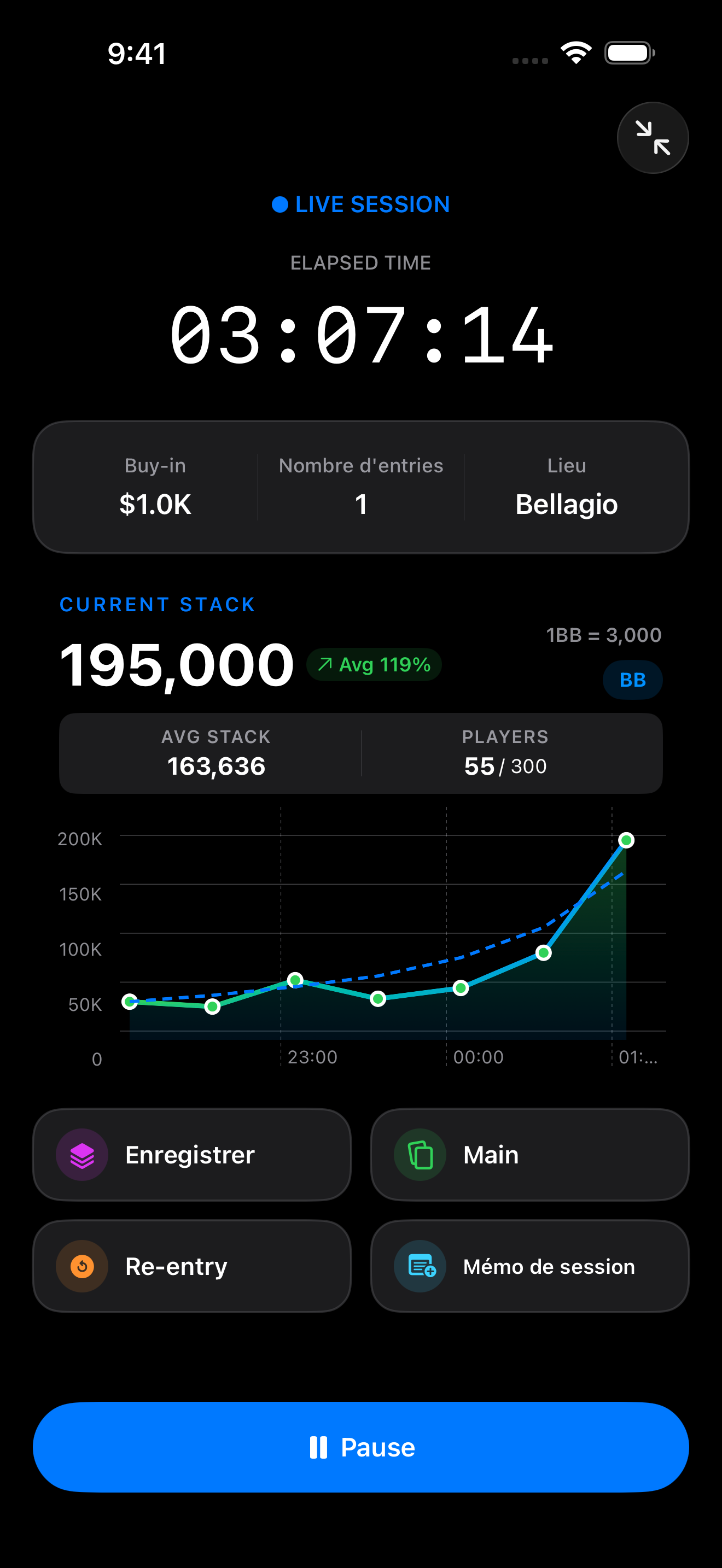 Télécharger sur l'App StoreEnregistrez vos résultats de session en temps réel. Cash games et MTT pris en charge.