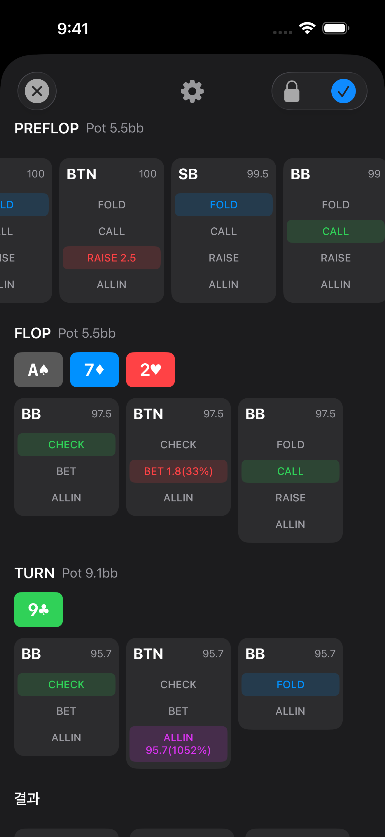 세션 중 주요 핸드를 기록. 프리플랍부터 리버까지 액션을 저장합니다.
